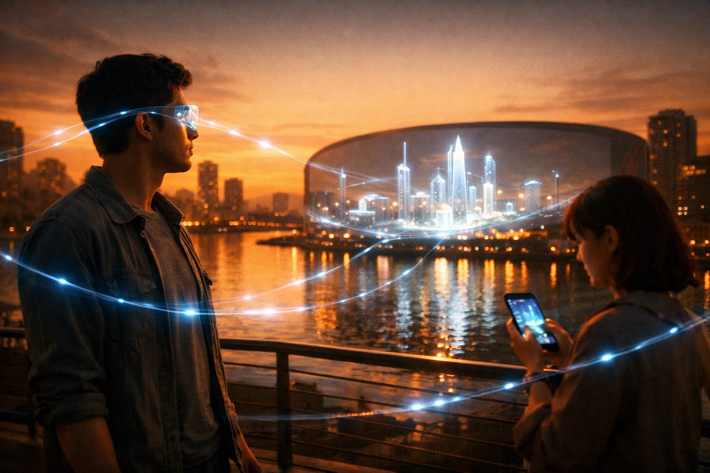 When that latency disappears, the blending of digital and physical environments stops being a product category and starts being an ambient fact of urban life. Multiplayer is no longer server-mediated and lag-compensated. It is immediate. Stadium gaming events are not about watching a screen — they are about thousands of participants sharing a single compute environment with individual interfaces. The arena becomes a platform. The city becomes a platform.